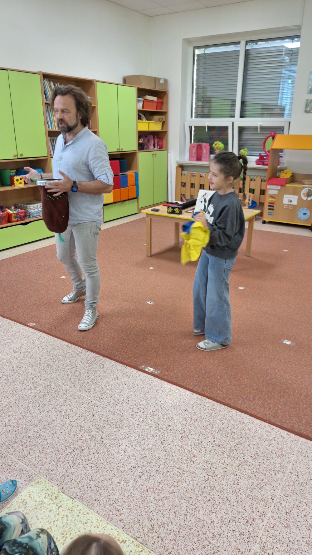 V pátek zavítal do naší školky kouzelník a herec, pan Tomáš Šulaj. Svým programem pobavil nejen třídu Sluníček a Motýlků, ale i prvňáčky. Do svých kouzel a zaklínadel zapojil také naše děti a na závěr je naučil trik s kouzelnickou hůlkou.