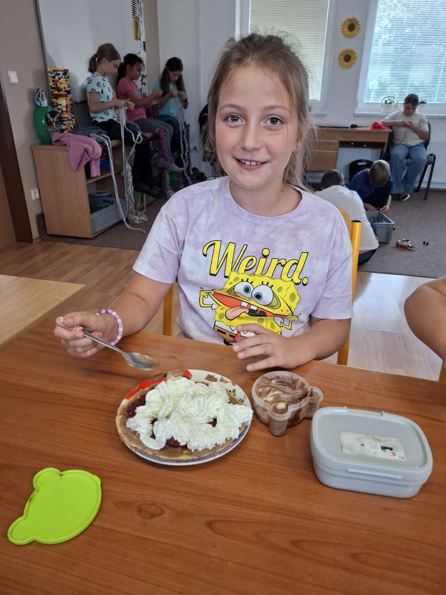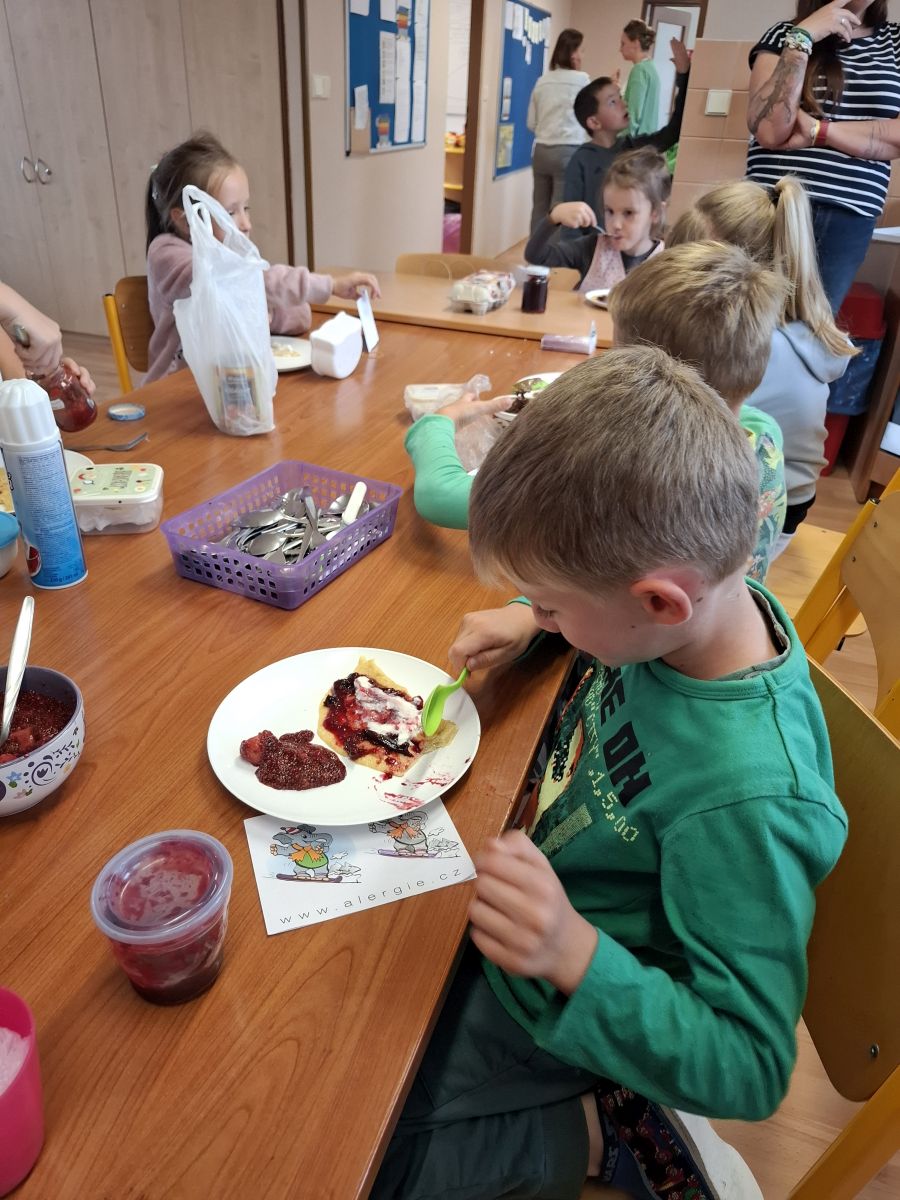Sýr, vejce a mléko jsme dali do mísy a rozmixovali, přidali mouku a vzniklo hladké těsto. Na pánvi jsme smažili tenké palačinky. Hotové si kuchtíci ozdobili džemem, nutellou a ovocem.